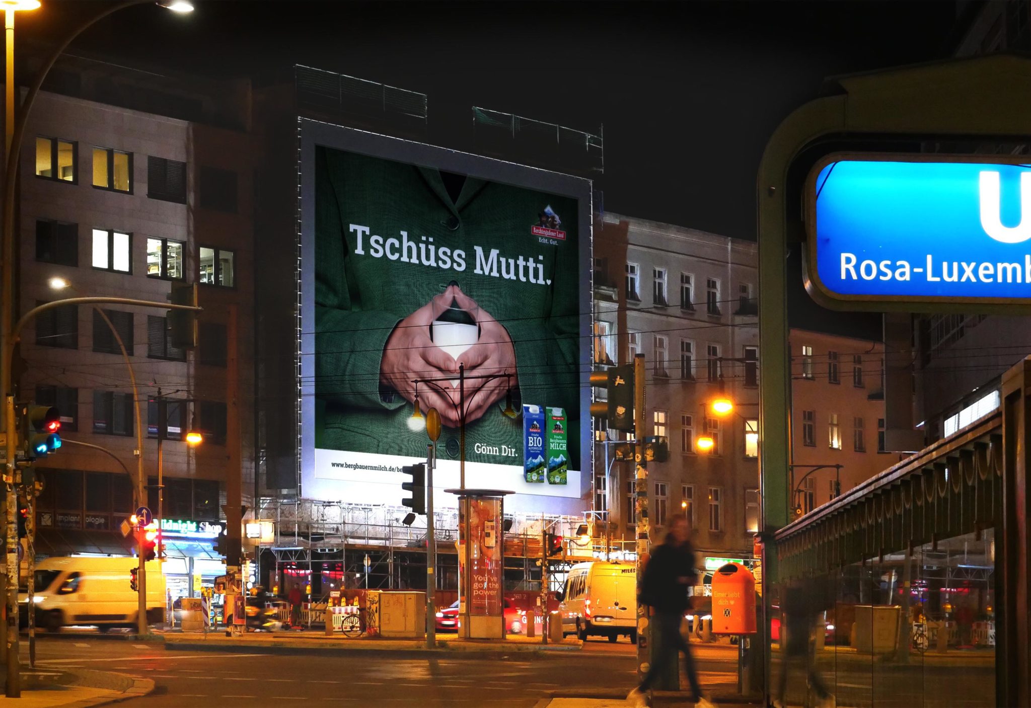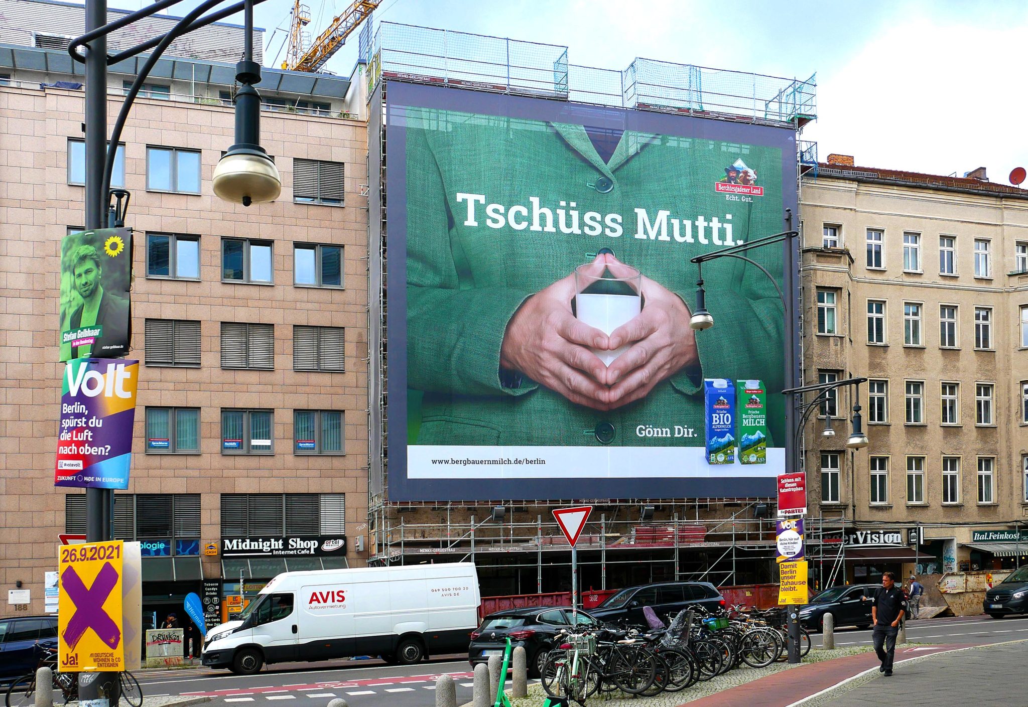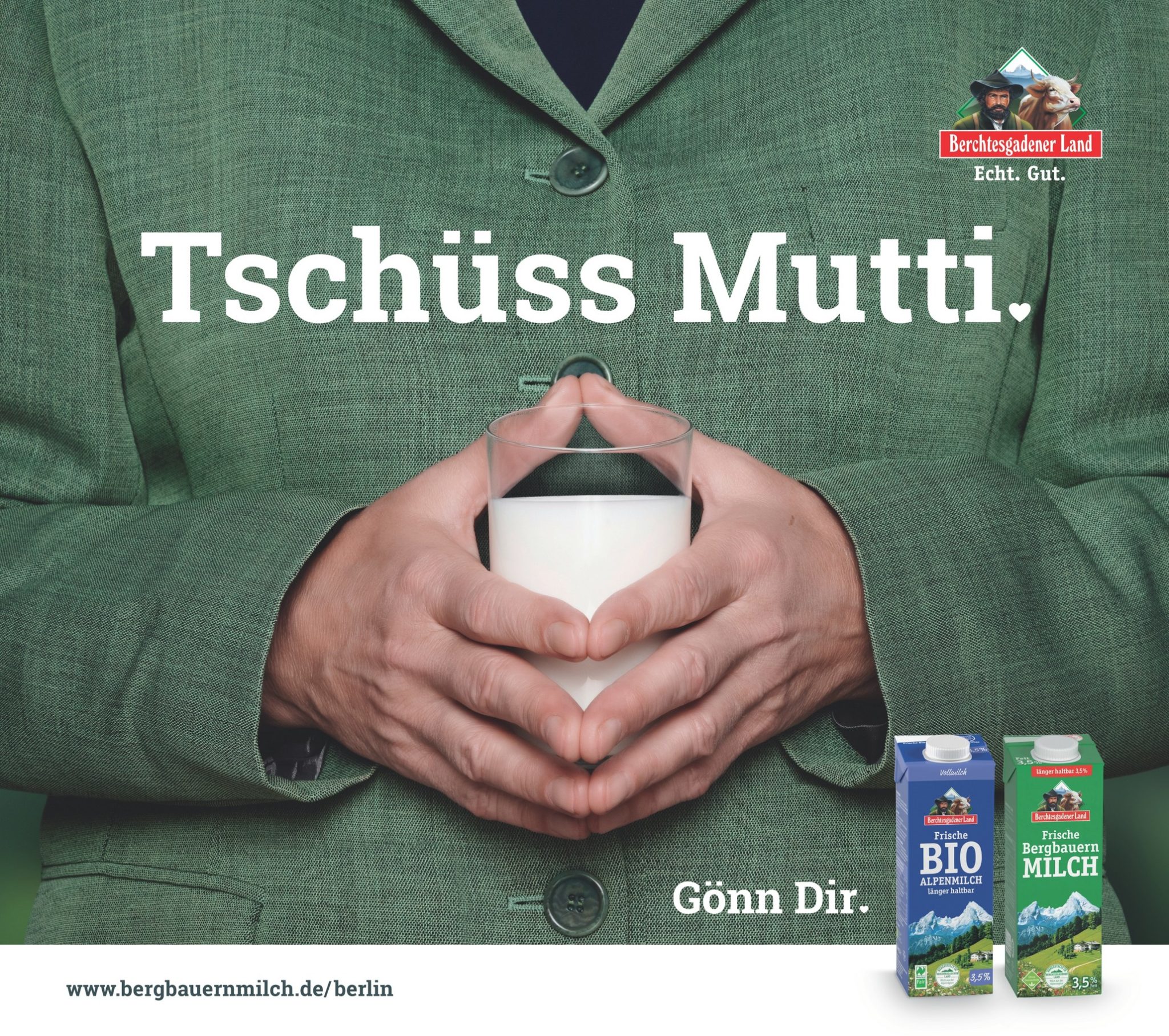 Dort verabschiedet die Molkerei Berchtesgadener Land die Kanzlerin mit einem freundlichen „Tschüss Mutti“ als Riesenposter. Zu sehen ist eine Interpretation der bekannten Merkel-Raute, die um ein Glas frische Bergbauern Milch der Molkerei Berchtesgadener Land bereichert wird. Die Idee zur Inszenierung der berühmten Raute kommt von der Berliner Niederlassung der Jeschenko MedienAgentur. Das Team in Berlin um Geschäftsführer Stephan Wirtz, berät die Molkerei Berchtesgadener Land bei Kommunikationsaktivitäten in der Hauptstadt Region.
