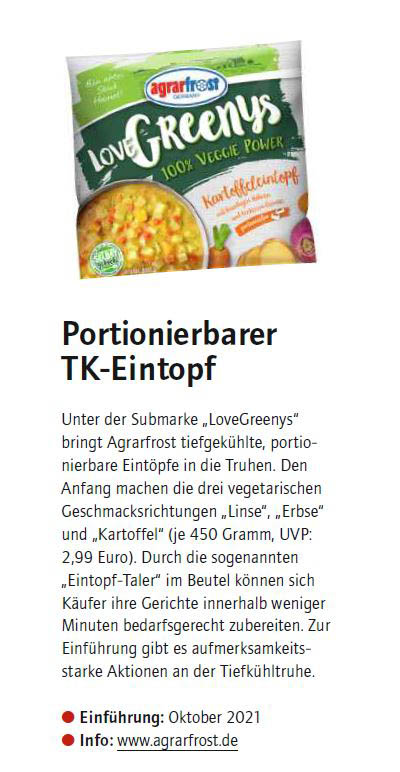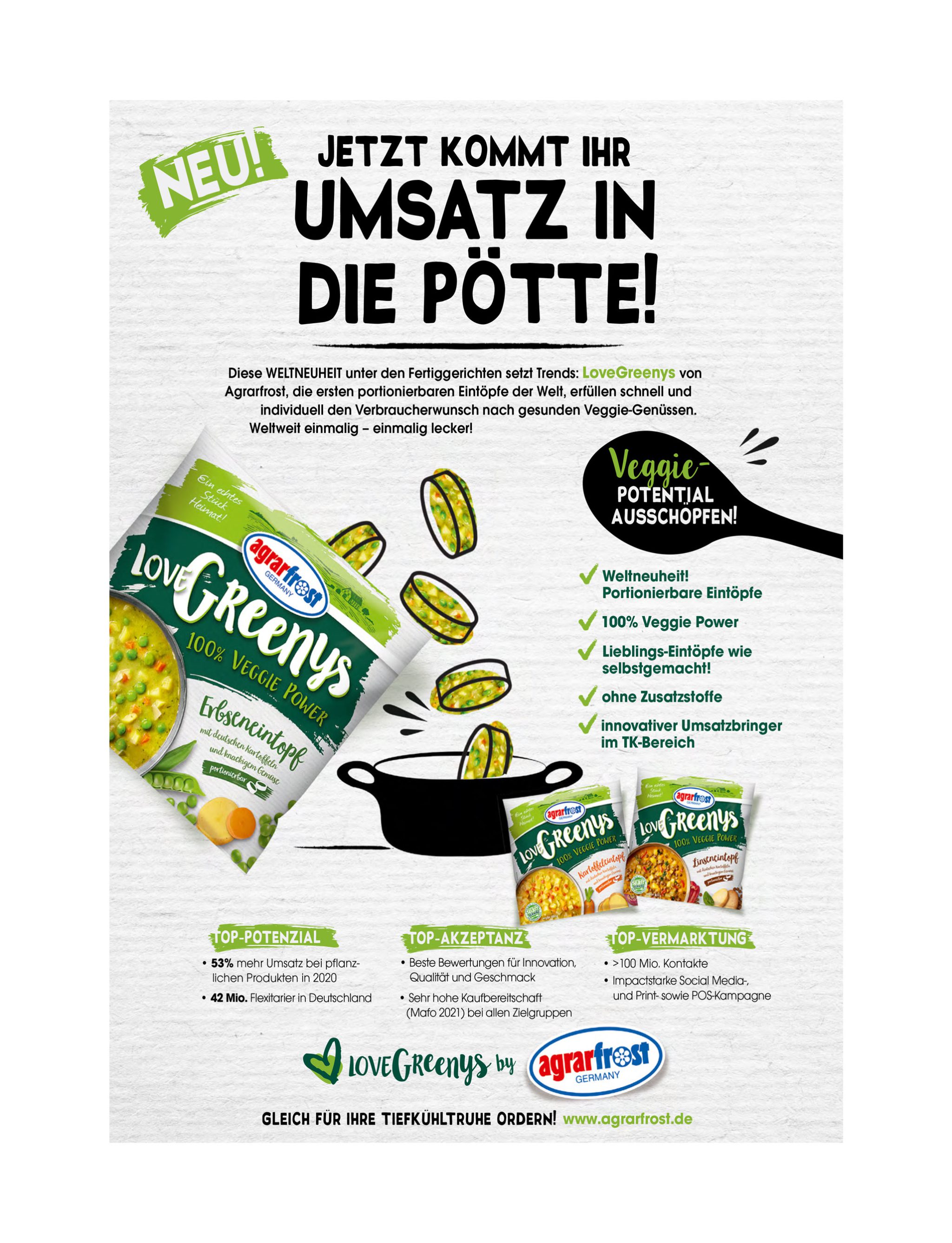 Die Eintopf-Revolution in der Tiefkühltruhe kommt von Agrarfrost: Mit „LoveGreenys“, der neuen Marke für natürlichen Eintopf-Genuss, setzt Agrarfrost auf eine innovative Neuinterpretation der in Deutschland gern gegessenen und in Familien beliebten Gerichte.