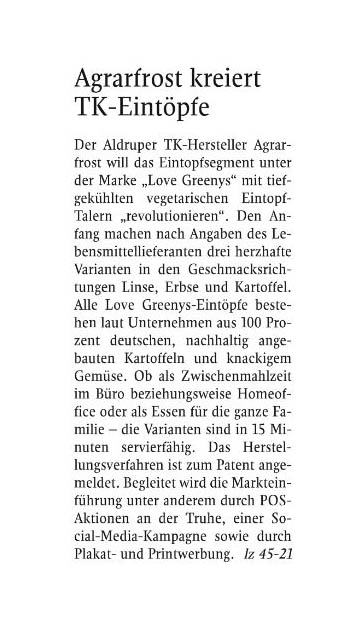 Begleitet wird die Markteinführung durch POS-Aktionen an der Tiefkühltruhe, Plakat- und Printwerbung sowie eine zielgruppenaffine Presse- und Social Media-Werbekampagne. Durch gezielte Fachpressearbeit bringt Jeschenko die Eintopf-Weltneuheit des Tiefkühl-Kartoffelspezialisten Agrarfrost bei den Fachjournalisten ins Gespräch und positioniert diese aufmerksamkeitsstark in der Handelsfachpresse.