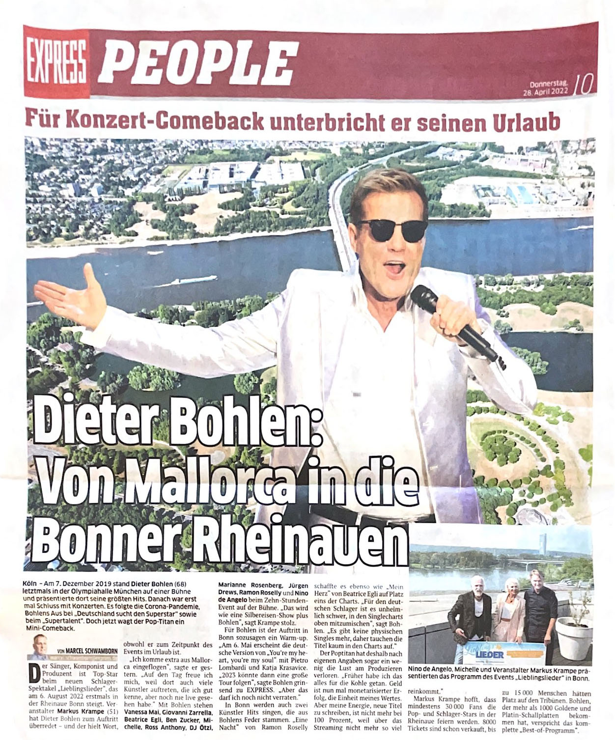 Es gibt musikalische Ohrwürmer, die einen ein ganzes Leben begleiten. Ob „Ein Bett im Kornfeld“, „Jenseits von Eden“ oder „You’re my heart, you’re my soul“: Jeder Musikfan kennt diese Titel und verbindet ganz besondere Momente mit ihnen. Beim Pressegespräch mit Michelle, Nino de Angelo und Veranstalter Markus Krampe (Markus Krampe Entertainment Group) sowie live zugeschaltet Dieter Bohlen im Hotel Kameha Grand Bonn zeigten auch die zahlreichen Pressevertreter ein offenes Ohr für das Open-Air Spektakel am 6. August, bei dem Deutschlands größte Schlagerstars mit ihren Mega-Hits live in der Bonner Rheinaue auftreten werden: Vanessa Mai, Giovanni Zarrella, Beatrice Egli, Ben Zucker, Michelle, Ross Antony, DJ Ötzi, Marianne Rosenberg, Jürgen Drews, Ramon Roselly und Nino de Angelo singen ihre größten Hits und werden für ein unvergessliches Sommer-Event sorgen. Doch damit nicht genug: Als Special Guest wird Pop-Titan Dieter Bohlen erwartet.